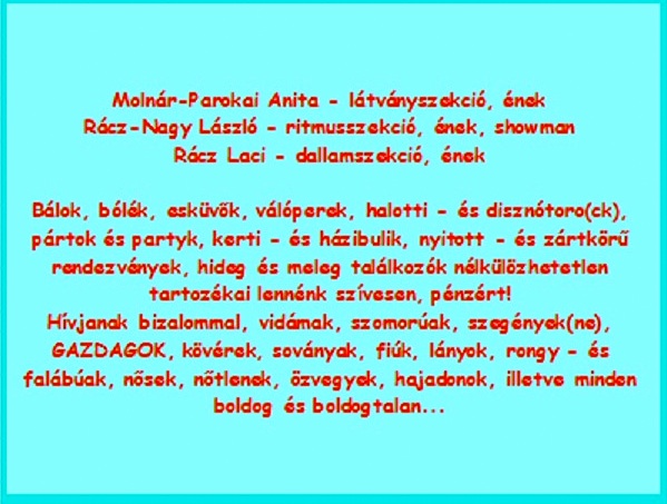 Megtaláljátok az elérhetőséget, ha szeretnétek, hogy a szórakoztatás kelléke legyen a zenekar.